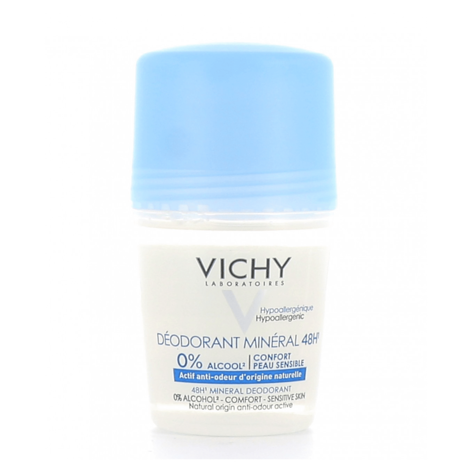 Vichy Déodorant Minéral 48H Roll-On 50 ml est un déodorant minéral sans sels d’aluminium, sans alcool, sans paraben qui convient à toutes les peaux, même fraîchement épilées.